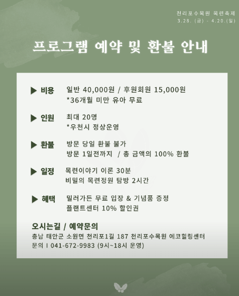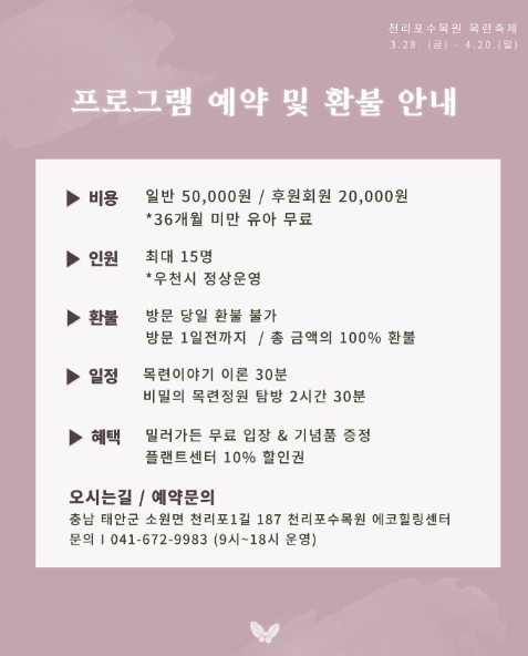 - 복장: 산정목련원은 산책 코스라 편한 신발과 겉옷 챙기세요.