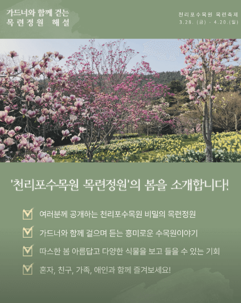 봄이 다가오면서 꽃구경 계획 세우는 분들 많으시죠? 충남 태안에 위치한 천리포수목원 목련축제는 국내 유일의 목련 테마 축제로, 특히 비밀의 정원이라 불리는 산정목련원을 사전 예약하면 특별한 경험을 할 수 있어요. 이 글에서는 예약 방법과 축제의 매력을 간단히 알려드릴게요!